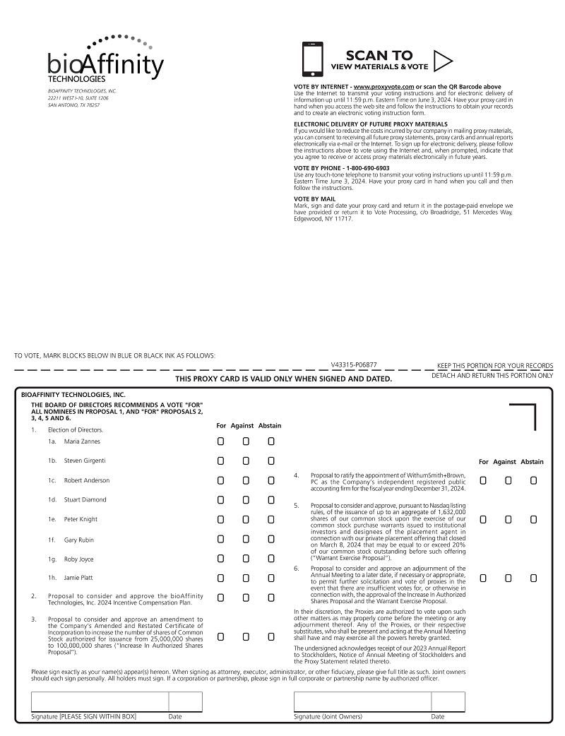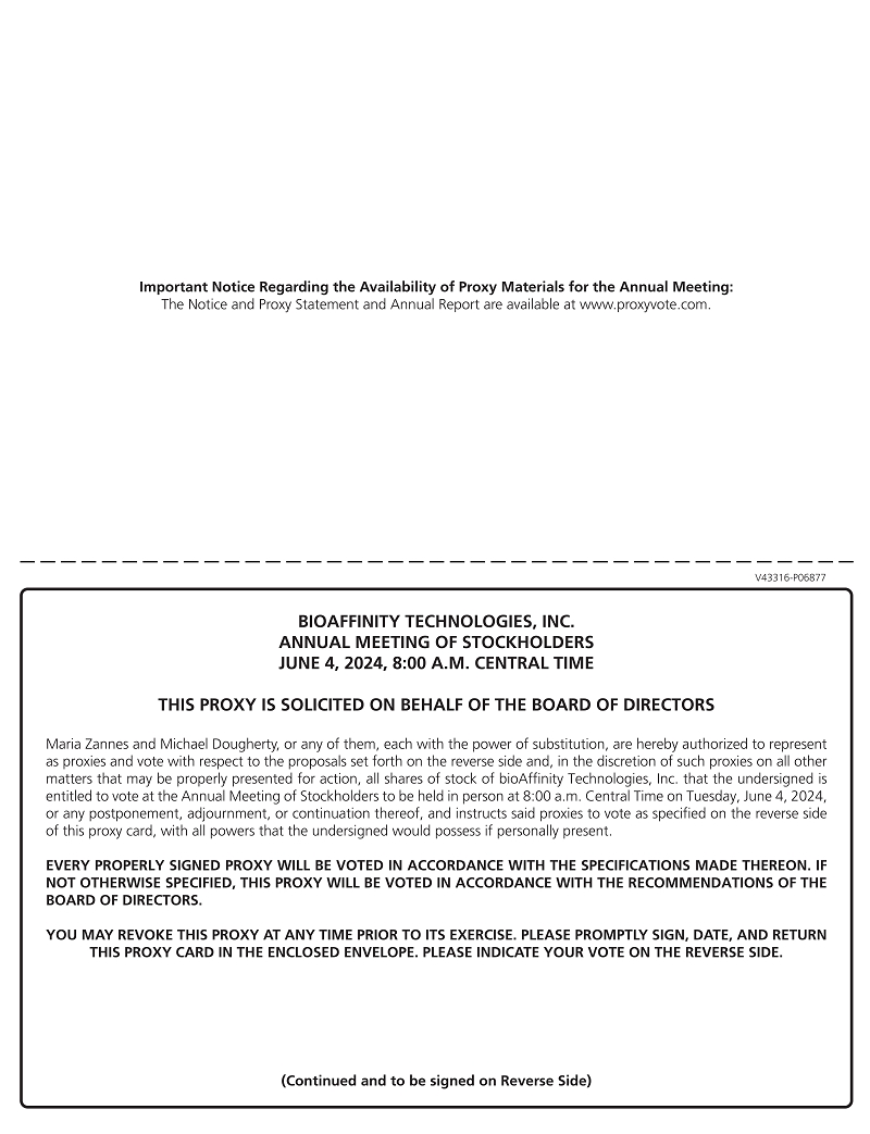 I am pleased to invite you to attend the Annual Meeting of Stockholders of bioAffinity Technologies, Inc. on Tuesday, June 4, 2024, at 8:00 a.m. Central Time. The Annual Meeting will be held in person at the Company’s principal office at 22211 West Interstate 10, Suite 1206, San Antonio, Texas 78257.