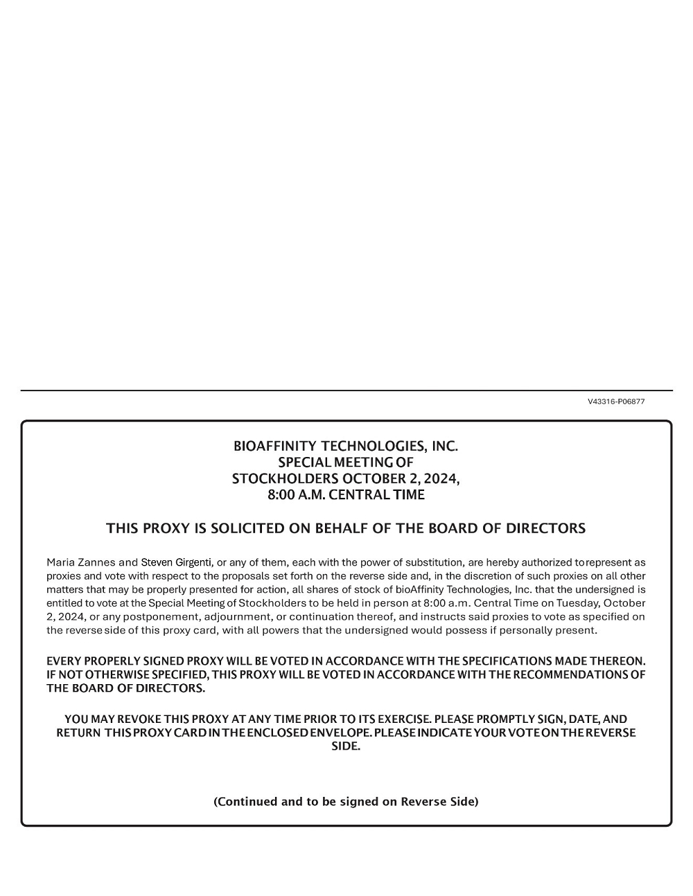 I am pleased to invite you to attend a Special Meeting of Stockholders of bioAffinity Technologies, Inc. on Wednesday, October 2, 2024, at 8:00 a.m. Central Time. The Special Meeting will be held in person at the Company’s principal office at 3300 Nacogdoches Road, Suite 216, San Antonio, Texas 78217.