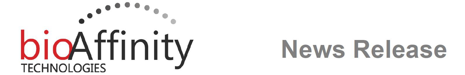 bioAffinity Technologies, Inc. addresses the need for noninvasive diagnosis of early-stage cancer and other diseases of the lung and broad-spectrum cancer treatments. The Company’s first product, CyPath® Lung, is a noninvasive test that has shown high sensitivity, specificity and accuracy for the detection of early-stage lung cancer. CyPath® Lung is marketed as a Laboratory Developed Test (LDT) by Precision Pathology Laboratory Services, a subsidiary of bioAffinity Technologies. For more information, visit www.bioaffinitytech.com.